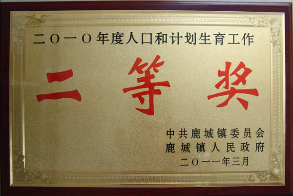 2010年鹿城镇委镇政府授予“年度人口和计划生育工作二等奖”