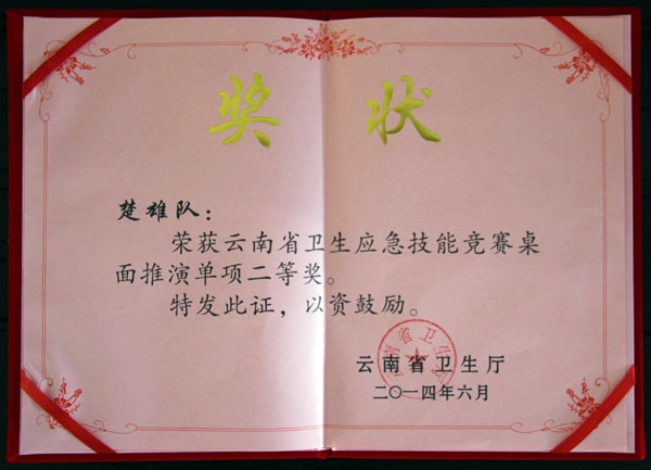 2014年6月云南省卫生厅授予应急技能竞赛桌面推演二等奖
