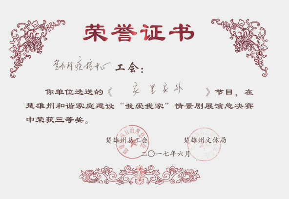 2017年6月楚雄州总工会、州文体局联合授予情景剧“家风家外”三等奖