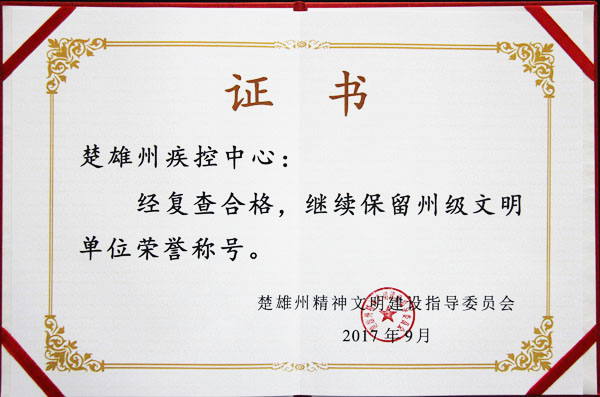 2017年9月楚雄州文明委授予中心文明单位荣誉称号