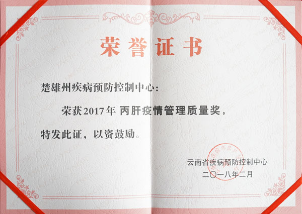 2018年2月云南省疾控中心授予丙肝疫情管理质量奖