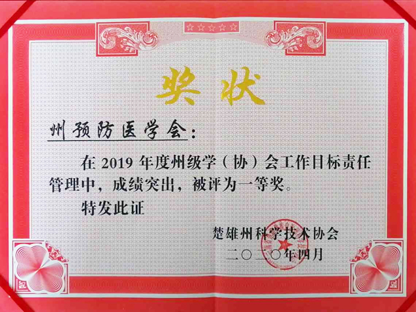 楚雄州预防医学会荣获2019年度州级学(协)会 工作目标责任管理考核一等奖
