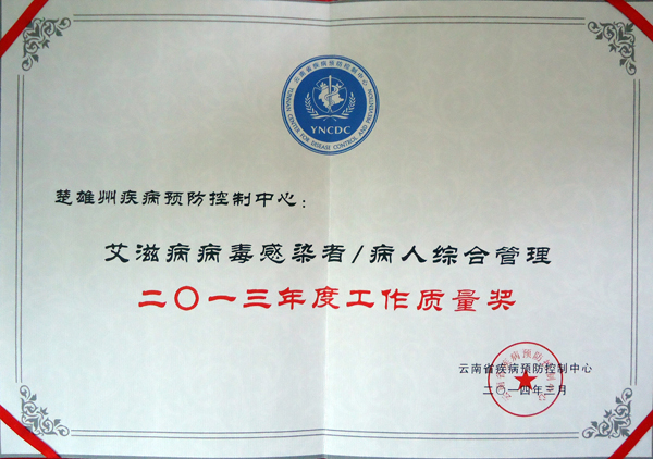 2014年3月省疾控中心授予2013年度艾滋病综合管理工作质量奖