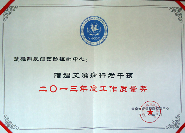 2014年3月省疾控中心授予暗娼艾滋病行为干预2013年度工作质量奖