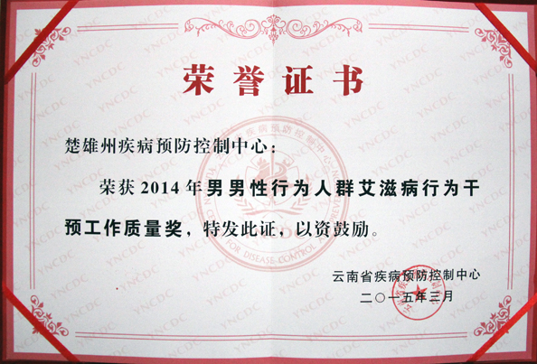 2015年3月云南省疾控中心授予男男性行为人群艾滋病行为干预工作质量奖